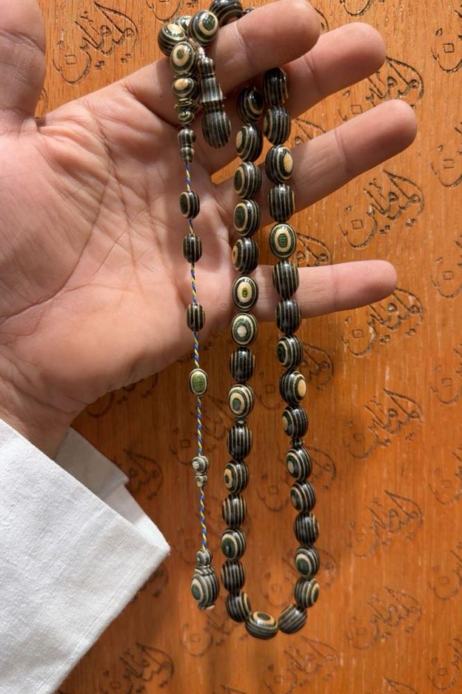 سبحة قرن ضان قص برميلي مقاس 7.80في13.40ملي عدد الخرز 33 خرزة طقم عربي