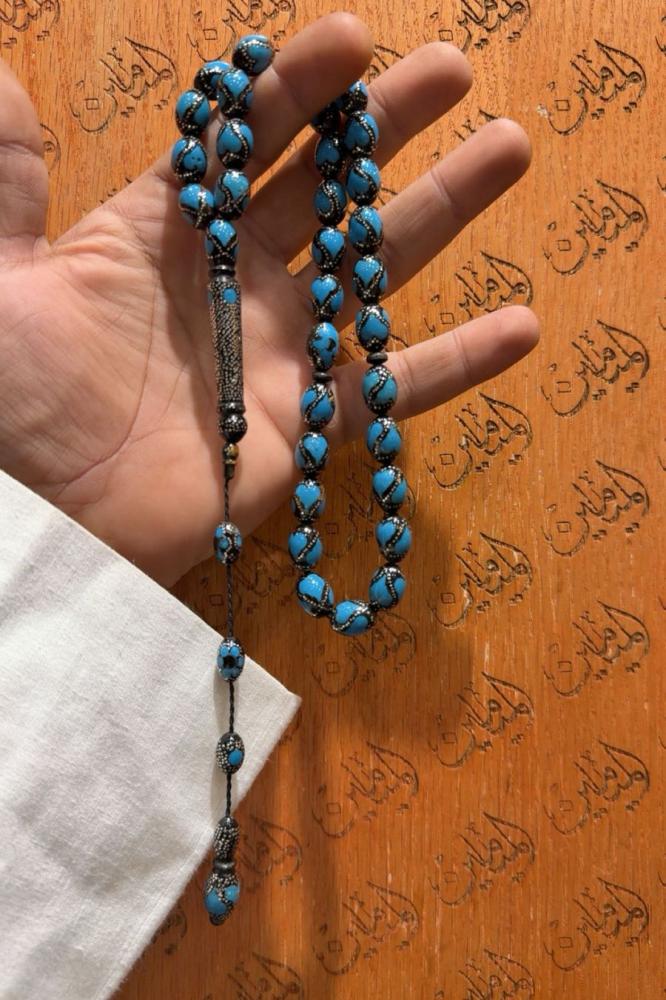سبحة يسر بلدي فضه مطعم احجار طبيعي مقاس 10 في 14.5 ملي عدد الخرز 33 خرزة