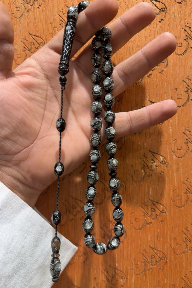 سبحة يسر بلدي فضه مطعم احجار طبيعي مقاس 10 في 14.5 ملي عدد الخرز 33 خرزة